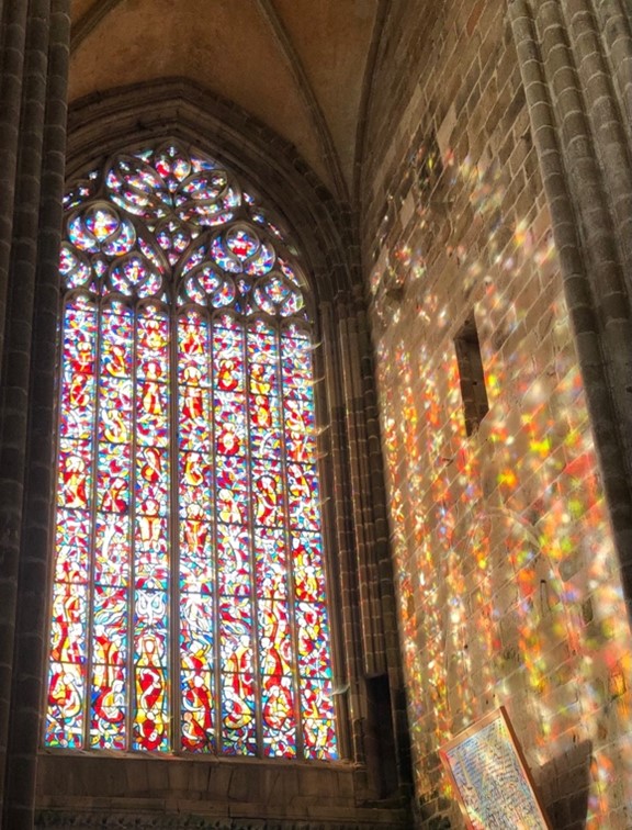 Chance light, shadow magic colors ground in glass— Here, a chance moment in the cathedral of Saint Tugdal, as if the Welsh monk himself decreed that the stones must carry on the stories broken in the stained glass and I say, a chance for chance angels to dance with echoes cast by the sun— ruby, cobalt, trace of antimony. Photo by poet taken in Tréguier, Brittany 9/2022.