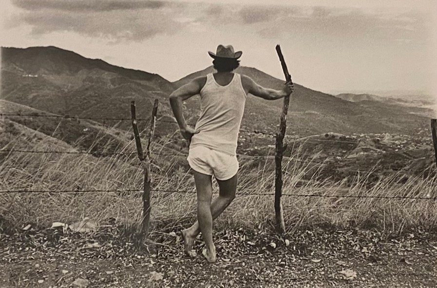 Untitled -- for Marcia Resnick I I wonder what he's thinking, if he's the one who put up the fence, wonder if the stick he's holding is going to be part of the fence, maybe to keep out anyone thinking of building in these hills. I wonder if a hand on his hip, the parallel triangle of the elbow echoing the bent knee of his crossed leg is passing judgement and wonder how long he's had that hat, how hot it is and whether the scrub and pebbles hurt his barefeet. What defines us in a moment? II Perhaps thinking elbows out, hand on hip one bare foot crossed in front of the other thoughts rolling like the hills, like those shifting clouds with all that possibility of might be all that could-be-food for musing on perhaps. I feel the pound of his heart in mine, pondering directions I imagine a small twitch of the jawbone, an intensity in the gaze, a total immersion in the perception of land a pause before the next moment.