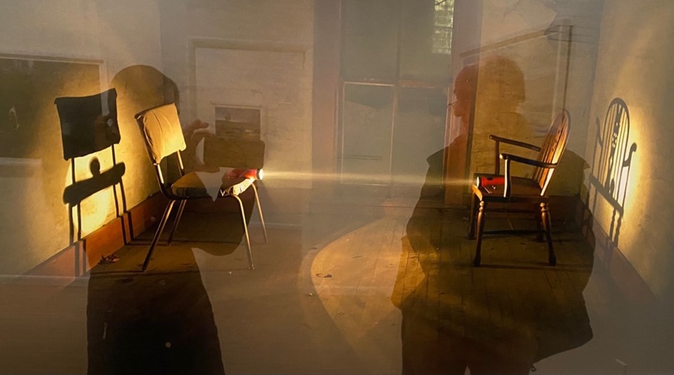 Superimposition How do I love thee? Let me light the ways— one flashlight gazing at the other, and beyond to the shadows cast, as we echo and praise, catch our reflection, to enter the picture, respond to our quiet need for light and for each other— How do we love? It is our secret discovered that light connects the old-fashioned lover (that chair with arms) with the slip-covered modern square, my rectangular camera reflected. Look at me, this way, I asked you, to be connected in this arrangement of radiance, chairs, so our gaze at each other is part of the picture! Let our vow, exchanging I do, as we continue in our maze of years, be visible in this brief reflection now. * Photograph: Part of exhibit ADAM EKBERG: MINOR SPECTACLES on view at the George Eastman Museum, January 14–September 3, 2023, Project Gallery https://www.eastman.org/ekberg